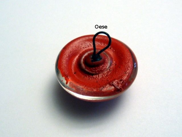 Das rote Tierauge hat auf der Rückseite eine Öse aus Draht. An dieser Öse wird das Auge am Stofftier mit normalen Faden angenäht.